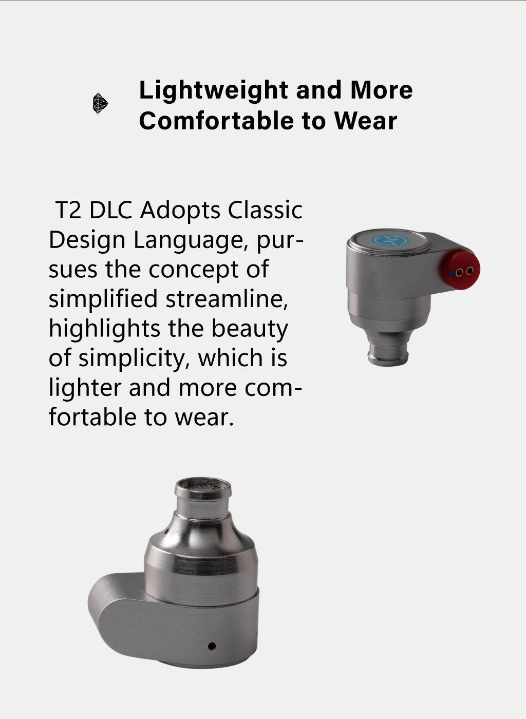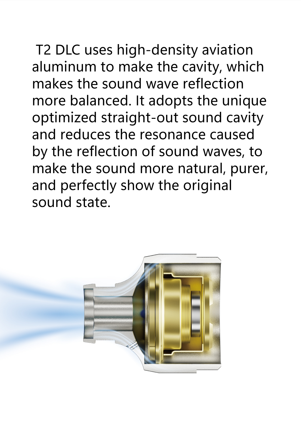 T2 DLC uses high-density aviation aluminum to make the cavity, which makes the sound wave reflection more balanced. It adopts the unique optimized straight-out sound cavity and reduces the resonance caused by the reflection of sound waves, to make the sound more natural, purer, and perfectly show the original sound state.
