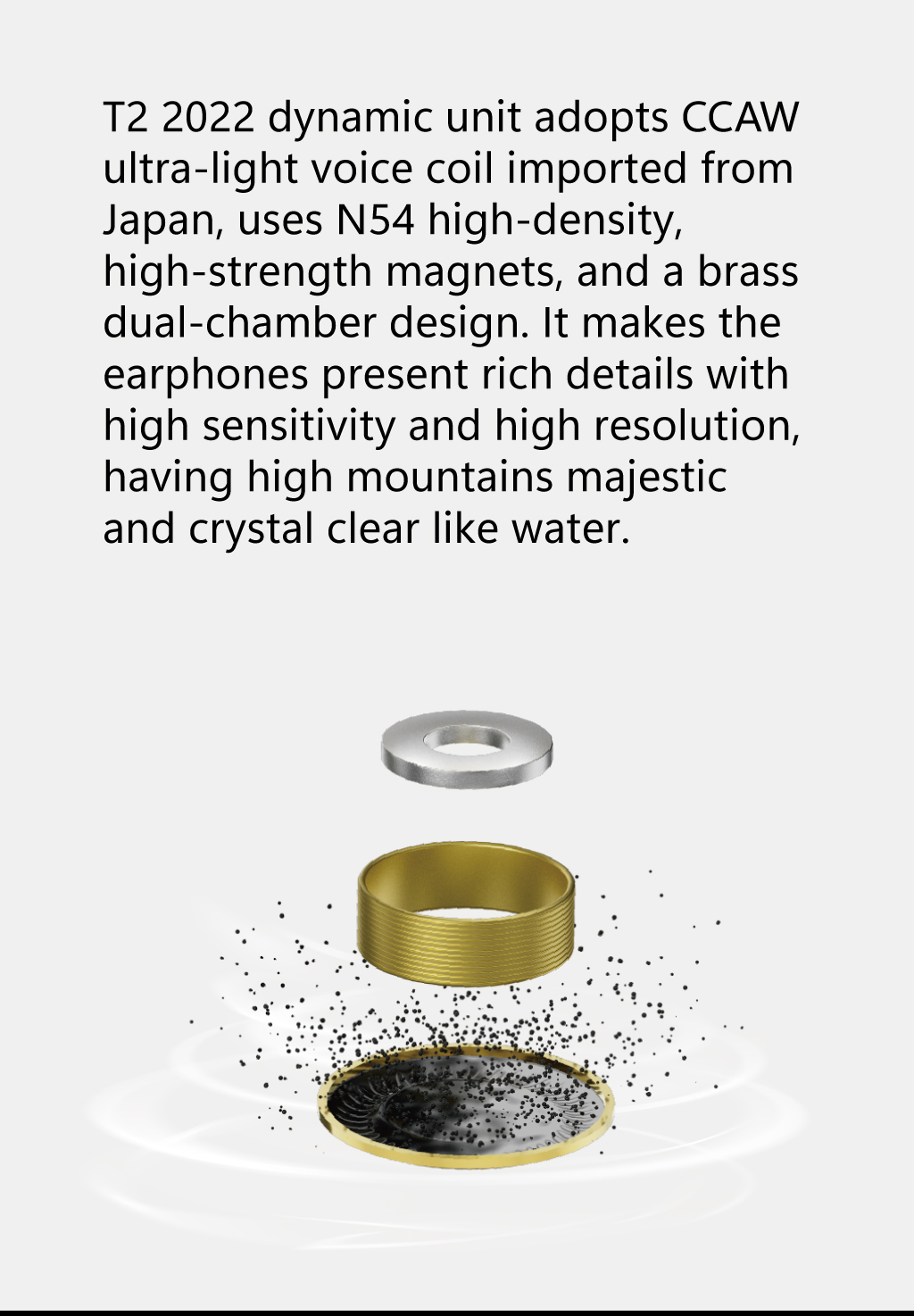 T2 2022 dynamic unit adopts CCAW ultra-light voice coil imported from Japan, uses N54 high-density, high-strength magnets, and a brass dual-chamber design. It makes the earphones present rich details with high sensitivity and high resolution, having high mountains majestic and crystal clear like water.