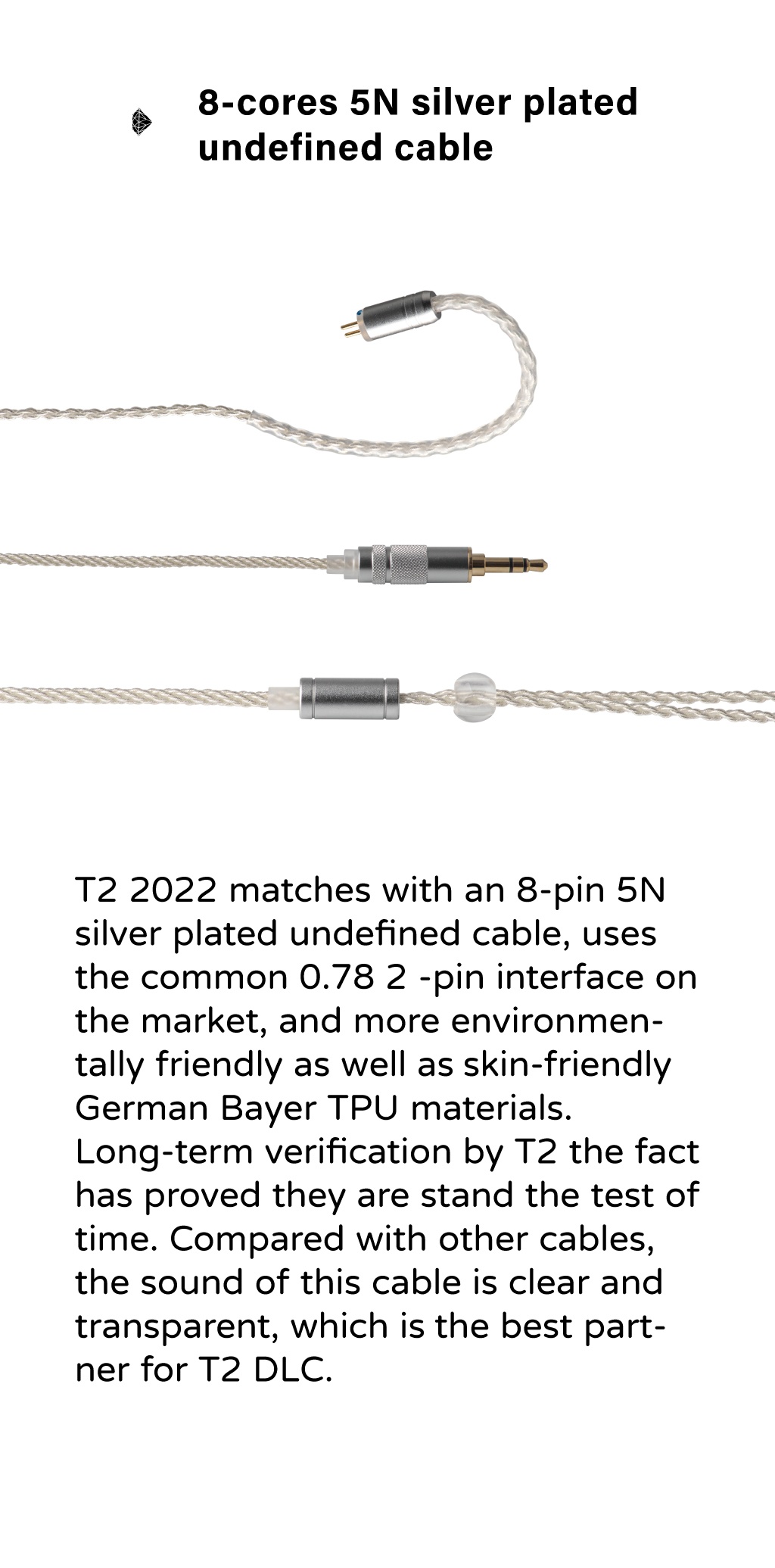 T2 2022 matches with an 8-pin 5N silver plated undefined cable, uses the common 0.78 2 -pin interface on the market, and more environmentally friendly as well as skin-friendly German Bayer TPU materials. Long-term verification by T2 the fact has proved they are stand the test of time. Compared with other cables, the sound of this cable is clear and transparent, which is the best partner for T2 DLC.